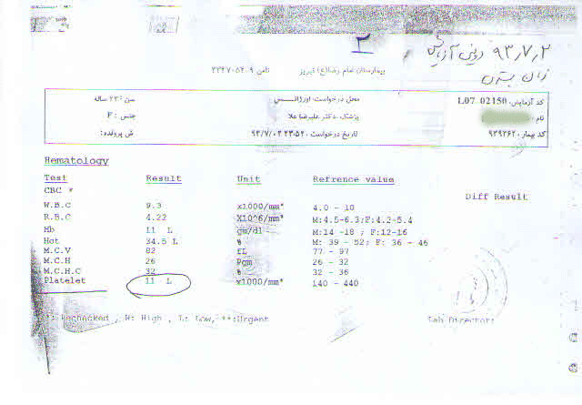 درمان ادامه پیدا کرده و به دستور دکتر حاج طالبی آزمایش مجدد درخواست می شود که با عنایت پروردگار در تاریخ 27/10/93 پلاکت بیمار به سطح 69 هزار می رسد .
