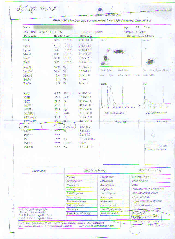 بیمار در شرح حال خود اظهار میکند که از مهر ماه 1393 لک های سیاهرنگی در بدنم ایجاد شد که مجبور شدم به مطب پزشکان فوق تخصص خون مراجعه کنم ، بعد از انجام آزمایشات پاراکلینیک مشخص شد پلاکت خون من 9هزار است .